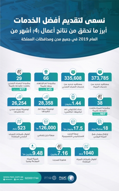 مشيرًا إلى أنه تم إبرام 67 عقدًا لتنفيذ مشاريع للبنى التحتية لقطاعي المياه والصرف الصحي بقيمة مالية تجاوزت 1,8 مليار ريال. كذلك تضمنت إنجازات الشركة لنفس الفترة الوصول إلى 1,440 مليون عداد ذكي تم تركيبها في مختلف المناطق، وتنفيذ 28,358 ألف توصيلة مياه، وما يزيد على 26,254 ألف توصيلة صرف صحي.