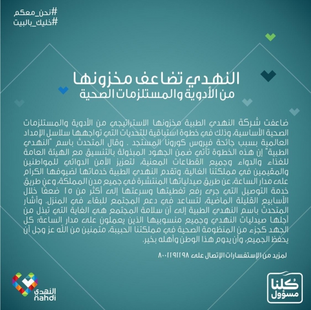 ضاعفت شركة النهدي الطبية مخزونها الاستراتيجي من الأدوية والمستلزمات الصحية الأساسية، وذلك في خطوة استباقية للتحديات التي تواجهها سلاسل الإمداد العالمية بسبب جائحة فيروس كورونا المستجد. وقال المتحدث باسم "النهدي الطبية" إن هذه الخطوة تأتي ضمن الجهود المبذولة بالتنسيق مع الهيئة العامة للغذاء والدواء وجميع القطاعات المعنية، لتعزيز الأمن الدوائي للمواطنين والمقيمين في مملكتنا الغالية. وتقدم النهدي الطبية خدماتها لضيوفها الكرام على مدار الساعة، عن طريق صيدلياتها المنتشرة في جميع مدن المملكة، وعن طريق خدمة التوصيل التي جرى رفع تغطيتها وسرعتها إلى أكثر من ١٥ ضعفًا خلال الأسابيع القليلة الماضية، لتساعد في دعم المجتمع للبقاء في المنزل. وأشار المتحدث باسم النهدي الطبية إلى أن سلامة المجتمع هي الغاية التي تبذل من أجلها صيدليات النهدي وجميع منسوبيها الذين يعملون على مدار الساعة؛ كل الجهد كجزء من المنظومة الصحية في مملكتنا الحبيبة، متمنين من الله عز وجل أن يحفظ الجميع، وأن يدوم هذا الوطن وأهله بخير.