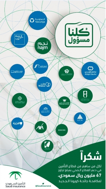 مبينا أن 17 شركة من قطاع التأمين قدمت تبرعات بمبلغ 67 مليون و726 ألف ريال سعودي، وشركات التأمين هي ( التعاونية، بوبا، تكافل الراجحي، ميدغلف، اتحاد الخليج، ولاء، الصقر، الدرع العربي، الوطنية، الأهلي تكافل، بروج، المتحدة، العربية، أكسا )، بالإضافة الى شركات نجم لخدمات التأمين و توافق الوسطاء لوساطة التأمين، والشركة العالمية المتحدة المحدودة لوساطة التأمين، مشيرا إلى أن قطاع التأمين لطالما كان داعما لمسيرة النجاح الوطنية، ومساهما لنمو الإقتصاد السعودي، بما يتملكه من مقومات وفرص واعدة للنمو والتوسع، عبر تضافر الجهود ورفع مستوى الشركات بين القطاع الحكومي والخاص، لاسيّما أن القطاع يشهد تحسنا ملحوظا من حيث تعزيز مساهمة القطاع الخاص بنسبة أكبر في الاقتصاد السعودي، وتعزيز الوعي بخدمات التأمين، عبر تطبيق القرارات الصادرة عن مؤسسة النقد العربي السعودي