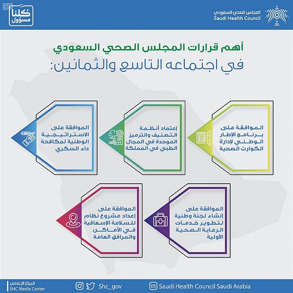 كما تمت الموافقة على الاستراتيجية الوطنية لمكافحة داء السكري، وقيام المركز الوطني للسكري التابع للمجلس بالتنسيق مع القطاعات المعنية لتنفيذ الأهداف الواردة في الاستراتيجية بعد اعتمادها من المقام السامي الكريم، ورفع تقرير سنوي عن نتائج تنفيذ الاستراتيجية في القطاعات.