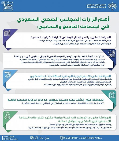 وافق المجلس الصحي السعودي في اجتماعه الـ 89 برئاسة معالي وزير الصحة رئيس المجلس الصحي السعودي الدكتور توفيق بن فوزان الربيعة، على برنامج الإطار الوطني لإدارة الكوارث الصحية، وقيام الأمانة العامة للمجلس بالتنسيق مع القطاعات المعنية لتنفيذ المخرجات الواردة في هذا الإطار بعد الاعتماد من المقام السامي.