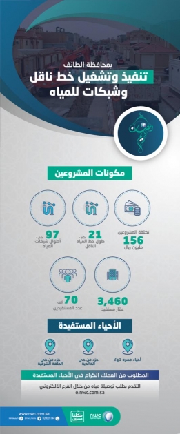 وبيّنت الشركة أن من ضمن المشاريع المنفذة، مشروع الخط الناقل للمياه بطول أكثر من (21) كم طولي، وشبكات للمياه شرق طريق المطار بمحافظة الطائف بتكلفة بلغت أكثر من 58 مليون ريال، وذلك لدعم الشبكات القائمة المنفذة بأحياء الحلقة وربطها بالخط الناقل الجديد، وزيادة ساعات ضخ المياه إليها، وتغذية الأحياء الجديدة بشرق طريق المطار.