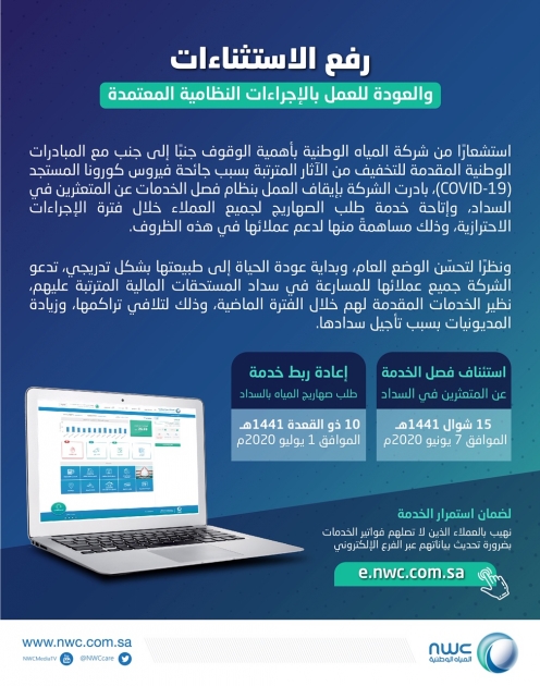 استشعارًا من شركة المياه الوطنية بأهمية الوقوف جنبًا إلى جنب مع المبادرات الوطنية المقدمة للمواطنين والمقيمين على أرض هذا الوطن للتخفيف من الآثار المترتبة بسبب جائحة فيروس كورونا المستجد (COVID-19) وسعياً منها لتحقيق رضا عملائها، بادرت الشركة بإيقاف العمل بنظام فصل الخدمات عن المتعثرين في السداد مع اتاحة خدمة طلب الصهاريج لجميع العملاء خلال فترة الإجراءات الاحترازية، وذلك مساهمةً منها لدعم عملائها في تلك الظروف.