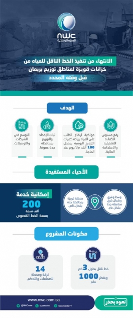 انتهت شركة المياه الوطنية من تنفيذ مشروع خط الربط الناقل للمياه من خزانات قويزة وتشغيله لتغذية مناطق التوزيع المرتبطة بخزانات بريمان الاستراتيجية بمحافظة جدة بتكلفة تجاوزت 19 مليون ريال. ويأتي تنفيذ المشروع لزيادة التوزيع بقرابة 100 ألف م3 يوميًا من مياه التحلية عبر بوابة قويزة الاستراتيجية في حال الحاجة، أو وجود أي ارتفاع للطلب في المناطق المستفيدة *ليخدم ما يزيد عن 200 الف نسمة بسعته القصوى*، بالإضافة إلى التوسع في مشاريع الشبكات والتوصيلات، وزيادة الضغوط لأحياء شرق وشمال شرق جدة، وثبات الإمداد والتوزيع للمدينة عمومًا، ولمناطق قويزة خصوصًا، وزيادة الموثوقية والاستدامة المائية لمنظومة التوزيع في حال انخفاض الوارد من المياه إلى بوابة بريمان الاستراتيجية، وتخفيف أثر أي انخفاض مفاجئ.