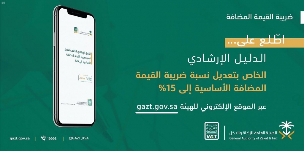 أطلقت الهيئة العامة للزكاة والدخل، دليلاً إرشادياً للمكلفين، بشأن رفع نسبة ضريبة القيمة المضافة الأساسية في المملكة العربية السعودية من 5% إلى 15%، يغطي جوانب متعددة من الأحكام المترتبة على تعديل نسبة الضريبة فيما يخص الأشخاص الخاضعين لها.