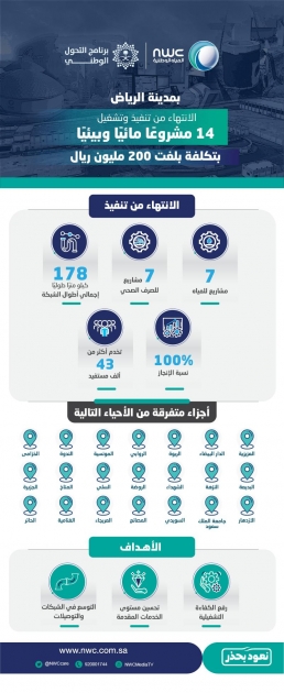 أعلنت شركة المياه الوطنية عن انتهائها من تنفيذ 14 مشروعًا مائيًا وبيئيًا ودخولها حيز التشغيل مطلع الشهر المقبل من العام الجاري في مدينة الرياض، بتكلفة تجاوزت 200 مليون ريال.
