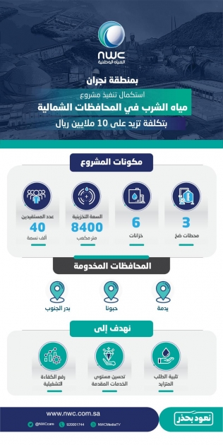 شرعت شركة المياه الوطنية مؤخرًا في استكمال عقد تنفيذ مشروع مياه الشرب للمحافظات الشمالية بمنطقة نجران، وهي: يدمه وحبونا وبدر الجنوب، حيث سيتم استكمال أعمال تنفيذ 3 محطات ضخ، و3 خزانات أرضية تشغيلية، و3 خزانات علوية بتكلفة تزيد على 10 ملايين ريال، وذلك لرفع نسبة تغطية خدمات المياه ومواكبة الطلب عليها في المنطقة.