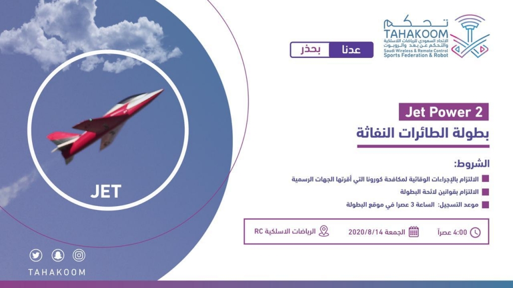 ينظم الاتحاد السعودي للرياضات اللاسلكية والتحكم عن بعد والروبوت "تحكم " ( غداً الجمعة ) بطولة الطائرات النفاثة وهي الأولى بعد استئناف النشاط الرياضي في المملكة إثر توقفه خلال الفترة الماضية بسبب تفشي فيروس كورونا المستجد .