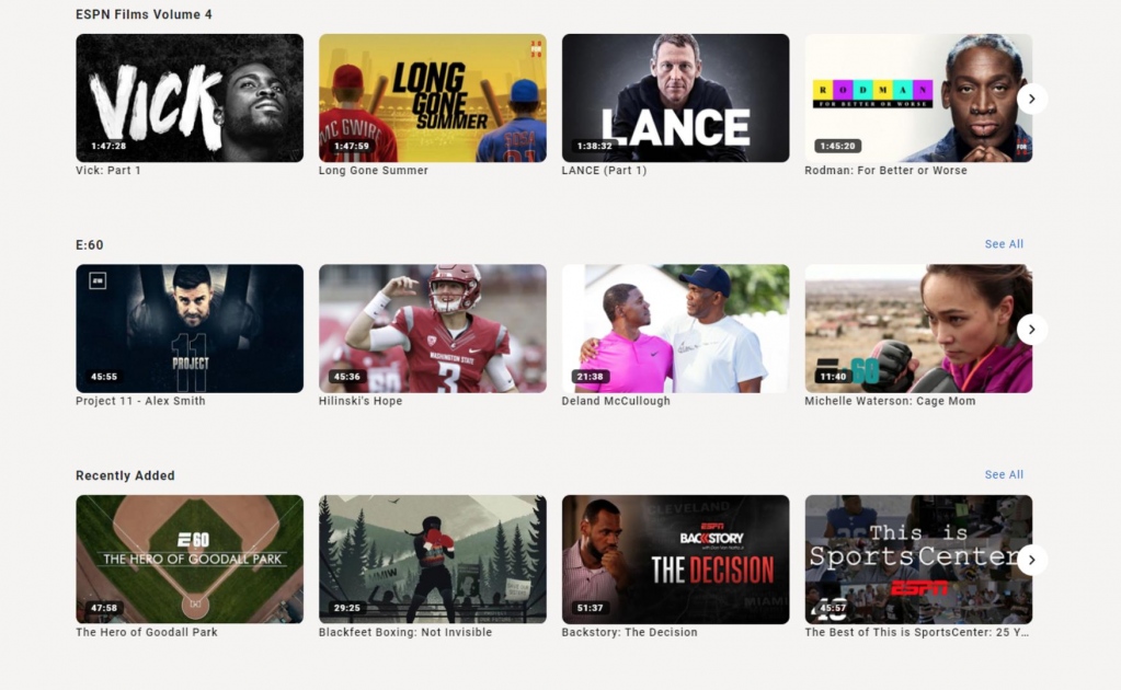 من المقرّر أن تقدّم خدمة ESPN Player أكثر من ٤۰۰ فيلم وثائقي وفيلم طويل، بما في ذلك: الفيلم الوثائقي الحائز على جائزة الأوسكار "OJ: Made In America"، الذي يستكشف العِرق والشهرة من خلال حياة أو جيه سيمبسون والفيلم الوثائقي الذي تم إصداره مؤخرًا بعنوان "LANCE"، وهو تسجيل للأحداث التاريخية بشكل مبهر وشامل وغني بالمعلومات لإحدى أكثر الشخصيات الرياضية الملهمة (ثم سيئة السمعة) على الإطلاق، من تقديم المخرجة القديرة مارينا زينوفيتش وكذلك فيلم "Be Water" من إخراج باو نغوين - يلقي نظرة شخصية عن قُرب على حياة رائد الفنون القتالية وأيقونة الثقافة الشعبية، بروس لي، ومصدر حماسه و فيلم "Rodman: For Better or Worse" يستعرض بنظرة متحرّرة وواضحة حياة دنيس رودمان، إحدى أكثر الشخصيات استقطابًا وإثارة للجدل في مجال كرة السلة، كما يستعرض الفيلم مسيرته المهنية بالإضافة إلى فيلم "Jordan Rides The Bus" يستكشف الأسباب التي دفعت أكثر الرياضيين حبًا للمنافسة إلى التخلي عن كرة السلة للمحترفين، بعد أن قاد فريق الأحلام للتتويج بميدالية ذهبية في دورة الألعاب الأوليمبية التي أقيمت عام ١۹۹۲ وقاد فريق البولز لانتزاع لقب بطولة "إن بي إيه" للعام الثالث على التوالي في العام التالي