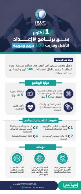 أعلنت شركة المياه الوطنية عزمها إطلاق برنامج "إعداد" في الأول من أكتوبر 2020م. وتهدف الشركة من برنامج" إعداد" إلى تأهيل وتدريب 100 خريج وخريجة في العديد من التخصصات الهندسية والفنية والإدارية.