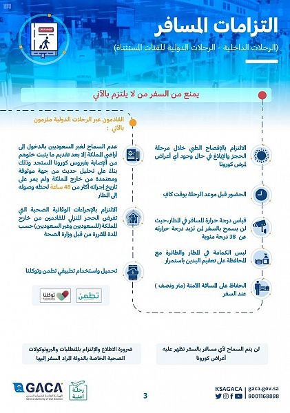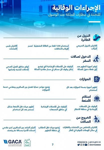 ويأتي هذا التحديث علاوة على البروتوكولات السابقة المطبقة سابقا ، ومن أبرزها شراء تذاكر الطيران عبر الوسائل الإلكترونية فقط ، والحضور قبل مواعيد إقلاع الرحلة بوقت كافٍ ، وقياس درجة حرارة المسافر في المطار ، حيث لن يسمح بالسفر لمن تزيد درجة حرارته عن (38) درجة مئوية ، إضافة إلى تعقيم اليدين عند الدخول إلى الصالة ، ولبس الكمامة القماشية أو غيرها أثناء الدخول إلى المطار "يمنع من السفر من لا يلتزم بلبس الكمامة" ، وارتداء الكمّامات والقفازات طوال مدة سير الرحلة وأثناء عملية النزول من الطائرة ، والالتزام بالإفصاح الطبي خلال مرحلة الحجز، والإبلاغ في حال وجود أي أعراض لمرض كورونا ، ويسمح لكل مسافر بحمل قطعة واحدة فقط من الأمتعة الشخصية داخل مقصورة الطائرة ، وتشجيع استخدام وسائل الدفع الإلكترونية والتقليل من استخدام الأوراق النقدية ، إضافة إلى تجنب الاصطفاف المتقارب في مرحلة الصعود إلى الطائرة وداخل حافلات النقل وجسور الإركاب ، والحفاظ على التباعد الجسدي والاجتماعي بين المسافرين في جميع مراحل السفر وعند مقدمي الخدمات ، وذلك من خلال الوقوف على الملصقات الإرشادية.
