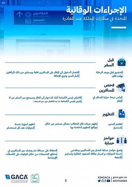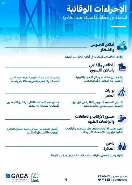 وقامت الهيئة بوضع حواجز زجاجية تفصل بين المسافرين ومقدمي خدمة إصدار بطاقة صعود الطائرة وتسليم الأمتعة ، وتوفير مناطق للعزل الصحي للحالات المشتبه بإصابتها ، وتشجيع استخدام وسائل الدفع الإلكترونية والتقليل من التعامل بالأوراق النقدية ، وتطبيق التباعد بين المسافرين لدى جميع مقدمي الخدمات والمطاعم والمقاهي بمسافة متر ونصف ، بالإضافة إلى الالتزام بالتصعيد التدريجي للطائرة من قبل مزوّد الخدمة ، وضمان عدم الاصطفاف المتقارب ، كما يتم تطهير جسور الإركاب وحافلات نقل المسافرين والرافعات الطبية قبل وبعد الاستخدام لكل رحلة ، وفي الطائرة يلتزم جميع الملاّحين والركّاب بارتداء الكمامات والقفازات طوال مدة سير الرحلة.