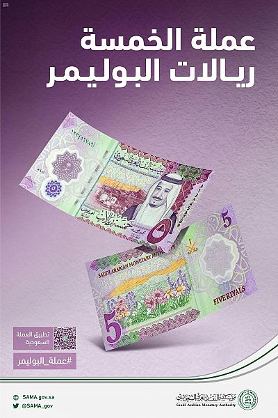 أعلنت مؤسسة النقد العربي السعودي "ساما" عزمها طرح فئة (خمسة ريالات) من العملة السعودية المصنوعة من مادة البوليمر في عهد خادم الحرمين الشريفين الملك سلمان بن عبد العزيز آل سعود - حفظه الله -، استناداً إلى المادة الرابعة من نظام النقد السعودي الصادر بالمرسوم الملكي رقم 6 بتاريخ 1 / 7 / 1379هـ.