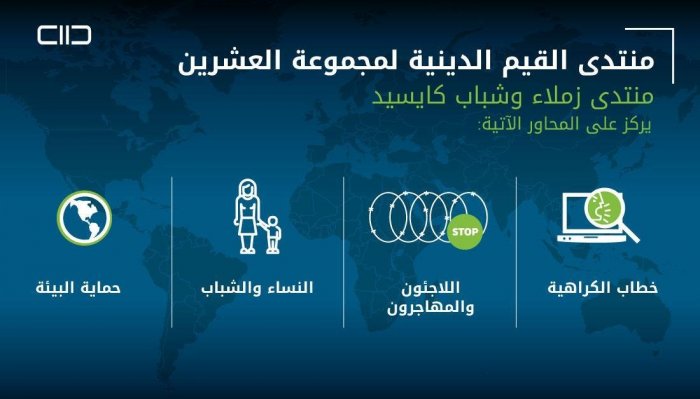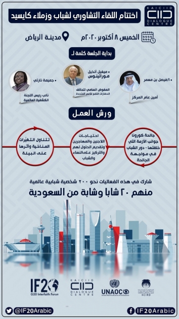اختتم مركز الملك عبدالله بن عبد العزيز العالمي للحوار بين أتباع الأديان والثقافات " كايسيد " لقاءه التشاوري لمنتدى القيم الدينية لمجموعة العشرين لشباب وزملاء المركز ، الذي انطلق افتراضيًّا من العاصمة الرياض ، عبر المنصات الإلكترونية ، بمشاركة نحو (200) شخصية شبابية دولية ، ومن مختلف الثقافات والأديان ، حيث نوقش أفضل التوصيات التي رُصدت تمهيدًا لمناقشتها في منتدى القيم الدينية لمجموعة العشرين ، المزمع انطلاقه يوم 13 أكتوبر الجاري.