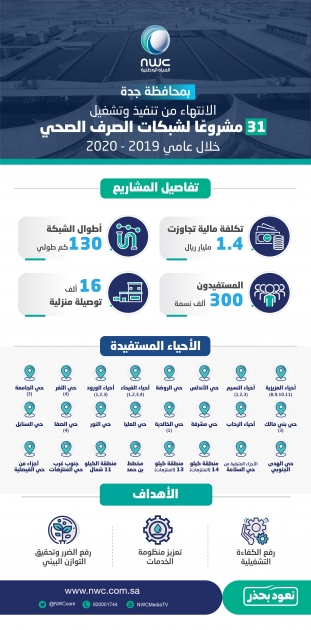 كشفت شركة المياه الوطنية عن الانتهاء من تنفيذ 31 مشروعًا لشبكات الصرف الصحي في محافظة جدة خلال عامي (2019م - 2020م)، ويأتي ذلك لتعزيز منظومة خدمات المياه التي تقدمها لعملائها، وتحسين كفاءتها التشغيلية ورفع الضرر البيئي.