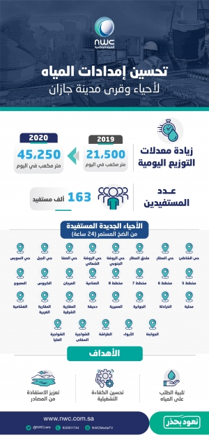 وقال جبر: "تم رفع كميات الضخ خلال عام 2020 إلى أكثر من 45 ألف متر مكعب يوميًا بدلاً من 21 ألف متر كعب في عام 2019"، مشيرًا إلى أن الأحياء الجديدة المستفيدة من الضخ المستمر (24 ساعة) في محافظة جازان والقرى التابعة لها هي: حي الشاطئ والمطار وملحق المطار والروضة الشمالية والجنوبية والصفا والجبل والسويس ومخططات (5 و6 و7 و8) والصناعية والمرجان وقرى الكربوس والمعبوج ومحلية والخرادلة والجوابرة والعميرية ودحيقة والمقارية الشرقية والغربية والغشامية والجوابنة والأيواء والطراشة والشواجرة السفلى والعليا.