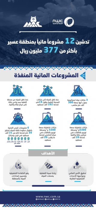 وبيّنت الشركة أن المشروعات التي دشنها سمو أمير منطقة عسير تضمنت أيضًا 25 مشروعًا بتكلفة تجاوزت 633 مليون ريال، كان منها 12 مشروعًا لقطاع المياه بتكلفة مالية تجاوزت 377 مليون ريال، تضمنت مشروع إنشاء خزانات مياه الشرب الاستراتيجية بجنوب مدينة أبها بسعة 300 ألف متر مكعب لرفع كمية الخزن الاستراتيجي في المنقطة إلى 1,150,000 متر مكعب، مشيرةً إلى أنه لمواكبة الطلب المتزايد على المياه، ورفع الكفاءة التشغيلية، وتحسين إمدادات المياه بالمنطقة نفذت خط نقل المياه ومنظومة الضخ اللازمة من الخزانات الاستراتيجية بمحافظة خميس مشيط، وصولاً إلى خزانات المدينة الطبية بطول 19 كلم، مع ربط منظومة التشغيل الحالية والمستقبلية لتعزيز الاستفادة من مصادر المياه المحلاة بالشقيق، وذلك ضمن مسار الخط لخدمة أكثر من 162 ألف مستفيد.
