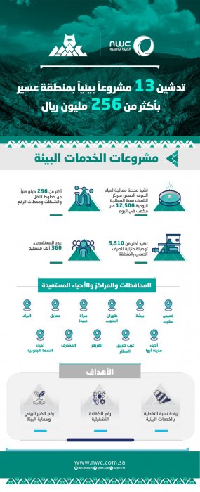دشّن صاحب السمو الملكي الأمير تركي بن طلال بن عبد العزيز أمير منطقة عسير، ووضع حجر الأساس لـ 30 مشروعًا بيئيًا ومائيًا في المنطقة، بتكلفة تجاوزت 800 مليون ريال. وستسهم هذه المشروعات في زيادة نسب التغطية بالخدمات المائية، ومواكبة الطلب المتزايد على خدمات المياه، وتحسين جودة الخدمات المقدمة، ورفع الكفاءة التشغيلية في نقل المياه وتوزيعها، وتحسين الأداء التشغيلي، وتحقيق تطلعات الحكومة الرشيدة برفع مستوى الخدمات المائية المقدمة للمستفيدين، إضافة إلى تعزيز منظومة مصادر المياه، والبُنى التحتية للخدمات المائية والبيئية.