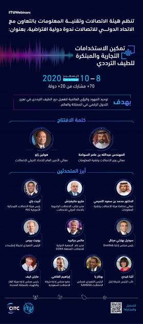 تعقد هيئة الاتصالات وتقنية المعلومات، في الفترة من 8 – 10 ديسمبر 2020م، ندوة دولية افتراضية بالتعاون مع الاتحاد الدولي للاتصالات ITU بعنوان "تمكين الاستخدامات التجارية والمبتكرة للطيف الترددي".