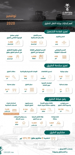 قامت وزارة النقل خلال شهر نوفمبر الماضي لعام 2020م، بعدد من الأعمال والمشروعات على الطرق التابعة لها في كافة مناطق المملكة، للمساهمة في رفع مستوى السلامة والجودة على الطرق وتعزيز كفاءة تشغيلها، من خلال فحصها وتحديد احتياجاتها بناء على العديد من الإجراءات والدراسات والاختبارات، إضافة إلى رفع مستوى الطرق الترابية وصيانتها.