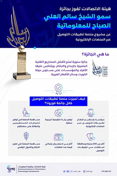 حققت هيئة الاتصالات وتقنية المعلومات اليوم، جائزة الشيخ سالم العلي الصباح للمعلوماتية في دورتها العشرين عن مشروع (منصة تطبيقات التوصيل عبر المنصات الإلكترونية)؛ إثر نجاح الهيئة في إطلاق المنصة أثناء جائحة كورونا من خلال توفير بيئة تنظيمية آمنة وإيجاد الحلول التقنية الناشئة والابتكارية في قطاع تطبيقات التوصيل لرفع طاقتها الاستيعابية وتحسين أدائها في جميع أنحاء المملكة؛ الأمر الذي أسهم في حماية الأمن الصحي من خلال الالتزام بالإجراءات الوقائية، وتعزيز الاقتصاد المحلي.