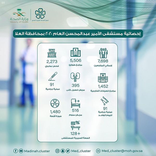 قدّم مستشفى الأمير عبد المحسن في محافظة العلا خدماته لـ 7698 مستفيداً خلال شهر نوفمبر للعام الحالي2020م .