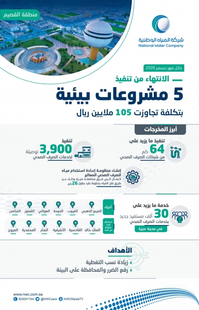 انتهت شركة المياه الوطنية، ممثلة بالإدارة العامة لخدمات المياه بمنطقة القصيم من تنفيذ (9) مشروعات للمياه والصرف الصحي وتشغيلها خلال شهر ديسمبر الماضي، وذلك بتكلفة تزيد على (360) مليون ريال، وتخدم أكثر من (50) ألف مستفيد في المنطقة.