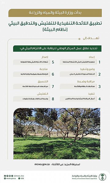 أعلنت وزارة البيئة والمياه والزراعة، بدء تنفيذ اللائحة التنفيذية للتفتيش والتدقيق البيئي في المملكة، وذلك بناء على المادة 48 من نظام البيئة الصادر بالمرسوم الملكي رقم (م/ 165) بتاريخ 19/ 11/ 1441هـ، وقرار مجلس الوزراء رقم (729) بتاريخ 16/ 11/ 1441هـ.