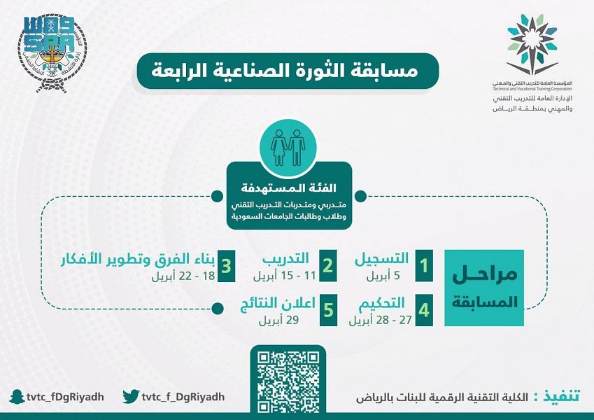وسيبدأ التسجيل للمسابقة بعد غد الاثنين عن طريق الباركود ، وتستهدف متدربي ومتدربات التدريب التقني وطلاب وطالبات الجامعات بالمملكة .