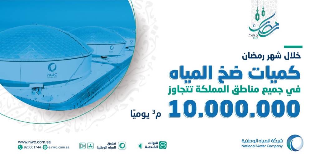 أكملت شركة المياه الوطنية استعداداتها لموسم شهر رمضان المبارك، إذ ستضخ وتوزع خلال الفترة المقبلة نحو ما يزيد عن 10 ملايين متر مكعب يوميًا في جميع مناطق المملكة ومدنها، بهدف توفير أكبر كمية من المياه لأهالي المناطق وزوارها خلال شهر رمضان، الذي عادة ما يشهد ارتفاعًا ملموسًا في الطلب على المياه.