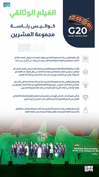 بث على قناة العربية السادس عشر من أبريل الحالي الفيلم الوثائقي "كواليس رئاسة مجموعة العشرين"، الذي يصور كواليس وقائع انعقاد قمة الدول العشرين في المملكة نوفمبر الماضي 2020.