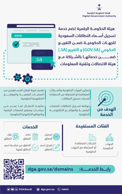انطلاقاً من كونها الجهة المختصة والمرجع الوطني لكل ما يتعلق بالحكومة الرقمية في المملكة، أعلنت هيئة الحكومة الرقمية إطلاق خدمات تسجيل أسماء النطاقات السعودية للجهات الحكومية ضمن التفريع الحكومي (gov.sa) والتفريع (.sa)، وذلك بالشراكة مع هيئة الاتصالات وتقنية المعلومات كونها الجهة المختصة بتنظيم وتشغيل أسماء النطاقات السعودية، حيث أوكلت هذه المهمة لهيئة الحكومة الرقمية تعزيزاً لدورها في تنظيم أعمال الحكومة الرقمية وتحقيقاً لحوكمة أفضل لخدمات تسجيل أسماء النطاقات الحكومية.
