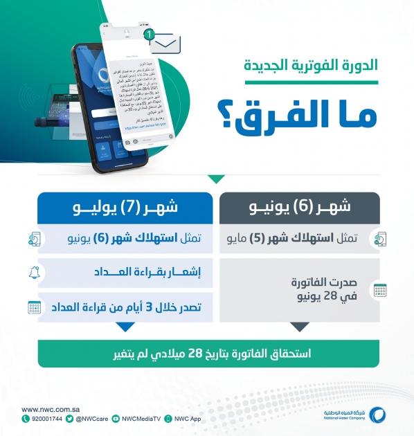 وأوضحت أن الفواتير الصادرة في 28- 6 –2021، هي استحقاقات استهلاك شهر مايو (5)، وأن الفواتير الصادرة خلال الأسبوع الأول من الشهر الجاري والمستمرة لبعض العملاء حتى نهاية الشهر، بحسب دورة القراءة لكل عميل، تمثل استهلاك العملاء في شهر يونيو (6).
