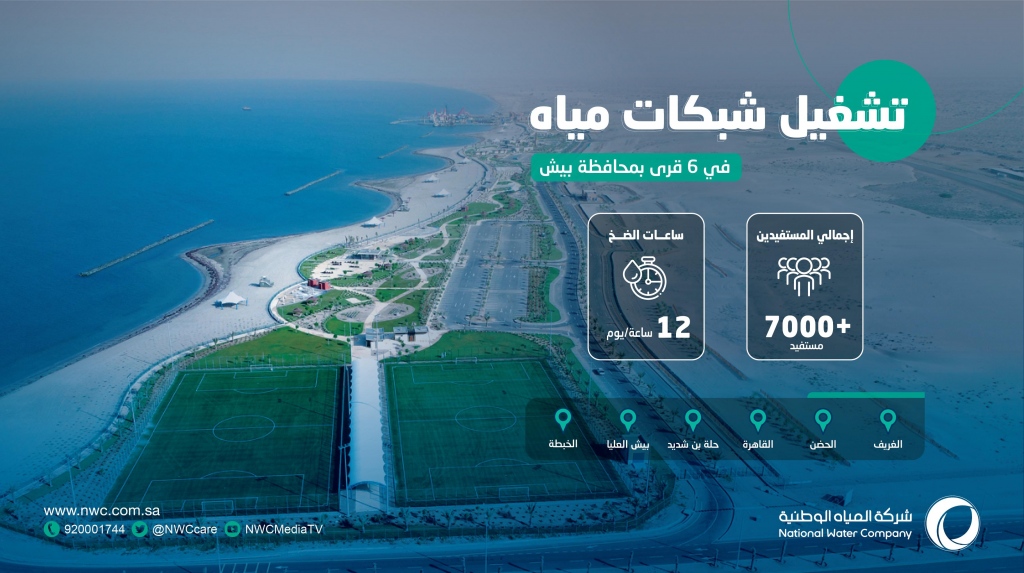 بدأت شركة المياه الوطنية تشغيل شبكات المياه في قرى الغريف والحضن والقاهرة وحلة بن شديد وبيش العليا والخبطة بمحافظة بيش في منطقة جازان، تلبية لمواكبة الطلب المتزايد على خدمات المياه، إضافة إلى تعزيز منظومة مصادر المياه، والبُنى التحتية للخدمات المائية والبيئية.
