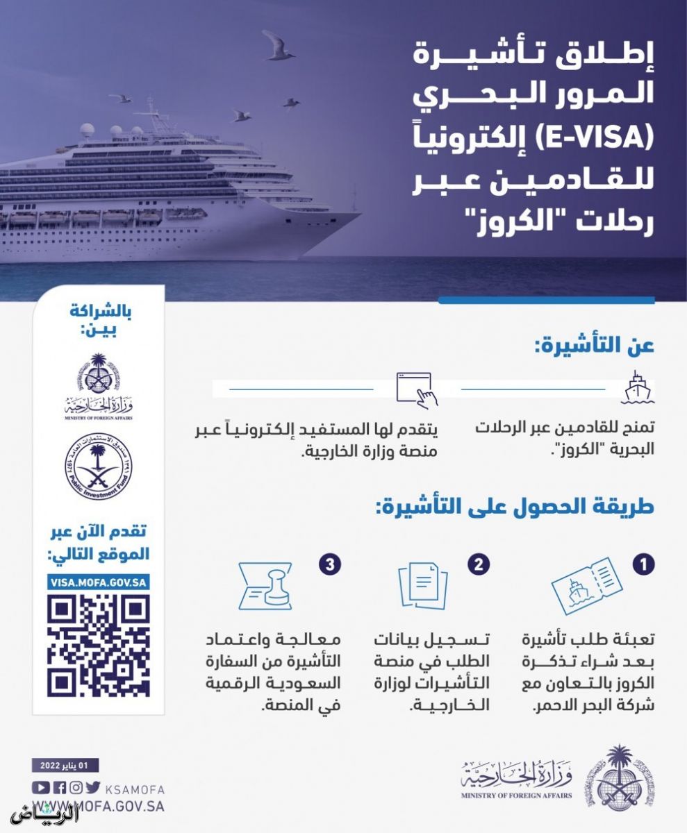 أعلنت وزارة الخارجية يوم السبت عن إطلاق تأشيرة المرور البحري للقادمين عبر رحلات "الكروز"، وأتاحت الحصول عليها إلكترونيا. وتم إطلاق الخدمة بالتعاون بين وزارة الخارجية وصندوق الاستثمارات العامة، وقالت الوزارة إنه يمكن التقدم للحصول على التأشيرة عبر منصة وزارة الخارجية.
