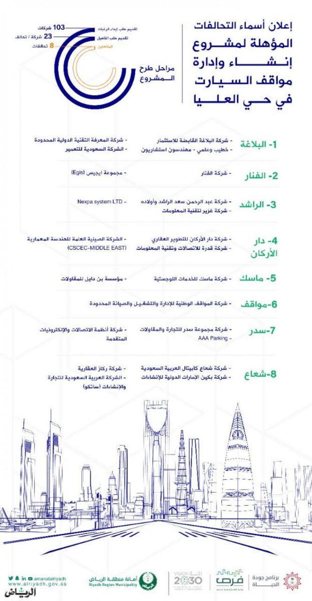 اعتمدت أمانة منطقة الرياض تأهيل ثمانية تحالفات للمنافسة على مشروع إنشاء وإدارة مواقف السيارات في حي العليا بالرياض.
