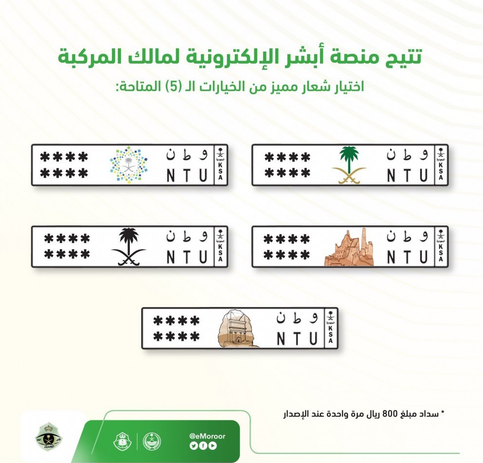 أعلنت الإدارة العامة للمرور، البدء بتفعيل خدمة إصدار لوحات المركبات بشعار مميز، من خلال (5) شعارات تتضمن "رؤية المملكة"، و"السيفين والنخلة - ملون وأسود"، و"مدائن صالح"، و"الدرعية"، ابتداء من الاثنين (21/ 2/ 2022 م الموافق 20/ 7/ 1443 هـ).