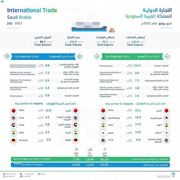 ووفقاً لنتائج النشرة، بلغت قيمة الصادرات غير البترولية (وتشمل إعادة التصدير) خلال شهر يوليو 2022 (27 مليار ريال)، مقابل (21 مليار ريال) خلال شهر يوليو 2021، وذلك بارتفاع مقداره (6 مليارات ريال)، بنسبة (26.4 %)، في حين بلغت قيمـة الـواردات السلعية للمملكـة خـلال شهر يوليو 2022 (55 مليار ريـال)، مقابـل (47 مليـار ريـال) خـلال شهر يوليو 2021، وذلك بارتفاع مقداره (8 مليارات ريال)، بنسبة (18.3 %).