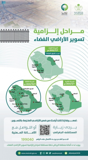 أعلنت وزارة الشؤون البلدية والقروية والإسكان إطلاق المرحلتين الثانية والثالثة لمبادرة تسوير الأراضي الفضاء، التي سيتم من خلالها إلزام ملاك الأراضي الواقعة أراضيهم ضمن المناطق المستهدفة بالتسوير بتاريخ 1 / 3 / 2023 للمرحلة الثانية، على أن يتم تطبيق المرحلة الثالثة بتاريخ 1 / 10 / 2023.