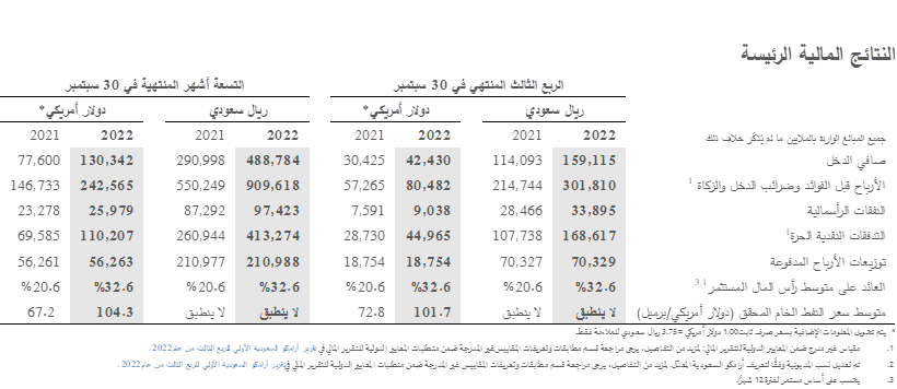 ارتفاع صافي الدخل في الربع الثالث بنسبة 39% على أساسٍ سنويٍ إلى 159.1 مليار ريال سعودي (42.4 مليار دولار أمريكي)، وزيادة التدفقات النقدية الحرة إلى رقمٍ قياسيٍ بلغ 168.6 مليار ريال سعودي (45.0 مليار دولار أمريكي)
