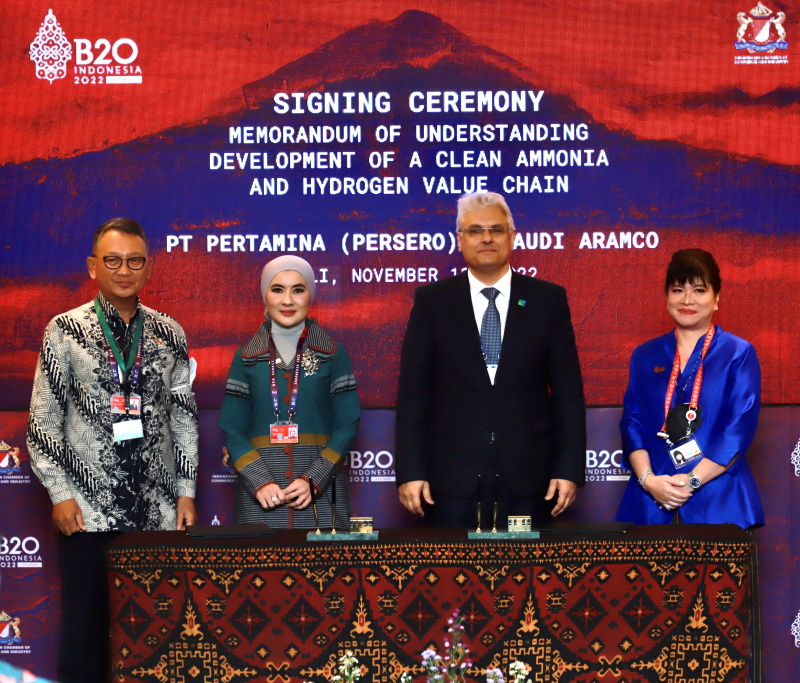 تدرس كل من أرامكو السعودية، الشركة المتكاملة والرائدة عالميًا في مجال الطاقة والكيميائيات، وشركة بي.تي. برتامينا (بيرسيرو)، شركة النفط والغاز الطبيعي والتعدين الإندونيسية، التعاون عبر سلسلة قيمة الهيدروجين والأمونيا، حيث وقعت الشركتان مذكرة تفاهم تحدد التعاون المستقبلي المحتمل عبر هذا المسار الرئيس لانتقال الطاقة، وذلك في منتدى الحوار الرسمي لمجموعة العشرين مع مجتمع الأعمال العالمي الذي أقيم على هامش قمة مجموعة العشرين المنعقدة في بالي الإندونيسية.