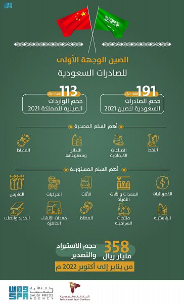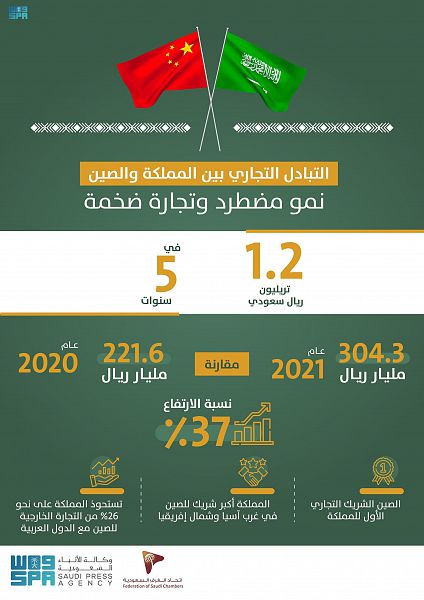 وأشار التقرير إلى النمو المطرد في حجم التبادل التجاري بين المملكة والصين والذي بلغ في عام 2021م 304.3 مليار ريال مقابل 221.6 مليار ريال في عام 2020م، مرتفعاً بنسبة 37%.، وفي ذات العام ارتفعت الصادرات السعودية إلى الصين 59% والواردات بنسبة 12%.