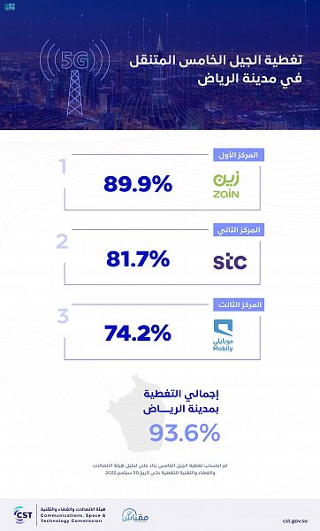 وكشفت الهيئة عن تصدر شركة زين لقائمة مقدمي خدمات الاتصالات في تغطية الجيل الخامس بمدينة الرياض بنسبة وصلت إلى 89.9%، فيما حلت شركة الاتصالات السعودية (stc)