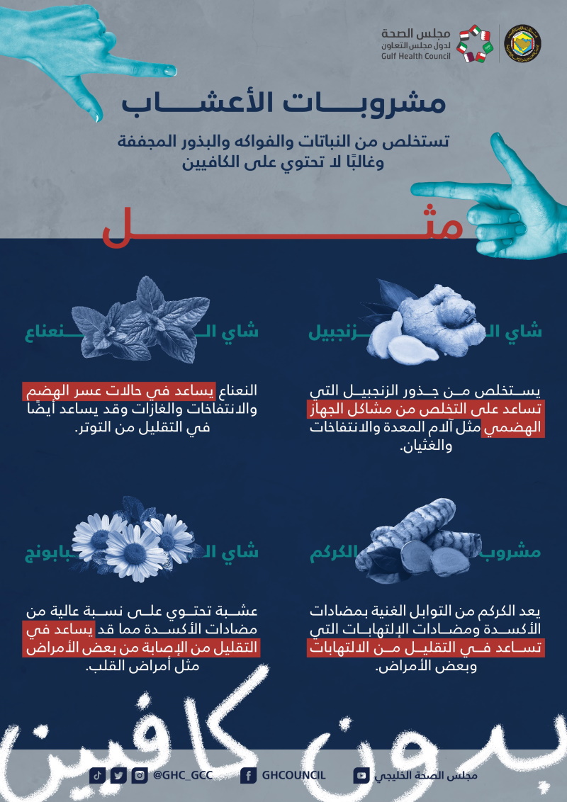 ومشروبـــــات الأعشـــــاب التي تستخلص من النباتات والفواكه والبذور المجففة وغالًبا لا تحتوي على الكافيين مثـــــــــل شاي الــزنجبيل الذي يخفف آلام المعدة والانتفاخات والغثيان، وشاي الــــــنعناع الذي يساعد في حالات عسر الهضم والانتفاخات والغازات ويساهم في التقليل من التوتر.
