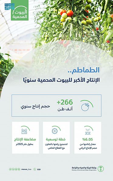 كشفت وزارة البيئة والمياه والزراعة عن حجم إنتاج الشركات المستثمرة في البيوت المحمية من محصول الطماطم والذي بلغ نحو 266,744 طنًا سنويًا، مؤكدة سعيها لتشجيع المستثمرين على استخدام التقنيــات الحديثـة في البيوت المحمية وفق مستهدفات رؤية 2030.