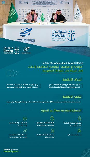 ووقع الاتفاقية من الجانبين رئيس الهيئة العامة للموانئ عمر بن طلال حريري، ورئيس مجلس إدارة شركة مراسي للخدمات البحرية الأستاذ طلال بن عثمان الحمدان.