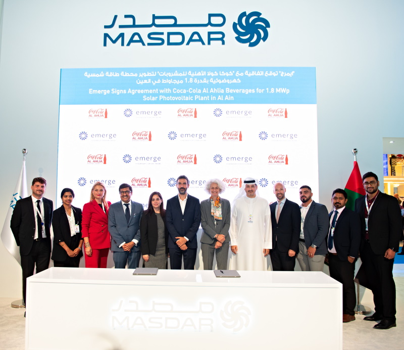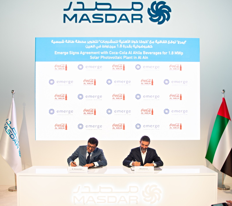 أعلنت "ايميرج"، الشركة المشتركة بين شركة أبوظبي لطاقة المستقبل "مصدر" و"اي دي اف" الفرنسية، عن توقيع اتفاقية مع "كوكا كولا الأهلية للمشروبات"، شركة تعبئة وتوزيع مشروب كوكا كولا في دولة الإمارات، لتطوير محطة طاقة شمسية كهروضوئية بقدرة 1.8 ميجاواط ضمن منشأتها للتعبئة في مدينة العين.