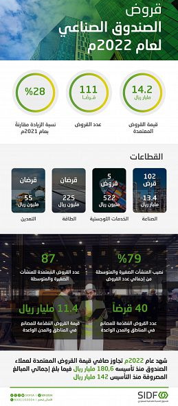 أعلن صندوق التنمية الصناعية السعودي، عن أرقام الدعم المقدم لعملائه في القطاع الخاص خلال العام المنصرم، بقروض معتمدة بلغت 14,2 مليار ريال لـ 111 قرضاً في قطاعات: الصناعة، الطاقة، التعدين، والخدمات اللوجستية، وذلك بزيادة بنسبة 28% عن قيمة القروض المعتمدة للعام 2021م.