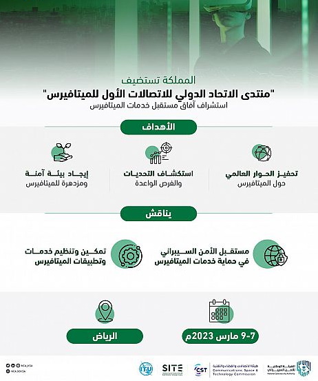 تستضيف المملكة الثلاثاء أعمال منتدى الاتحاد الدولي للاتصالات الأول للميتافيرس على مدى ثلاثة أيام، الهادف إلى تحفيز الحوار العالمي حول الميتافيرس، وتوفير منصة عالمية تستكشف التحديات والفرص الواعدة فيه، والإسهام في تعزيز معاييره وتنظيمه وإيجاد بيئة آمنة ومزدهرة لخدماته، والذي تنظمه الهيئة الوطنية للأمن السيبراني، وهيئة الاتصالات والفضاء والتقنية، والشركة السعودية لتقنية المعلومات "سايت"، بالشراكة مع وكالة الأمم المتحدة المتخصصة بالاتصالات وتقنية المعلومات (الاتحاد الدولي للاتصالات).