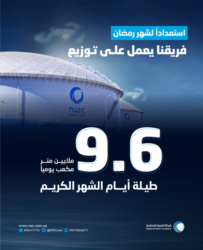 أكملت شركة المياه الوطنية استعداداتها لموسم شهر رمضان المبارك، إذ ستوزع خلال الفترة المقبلة نحو ما يزيد على (9.6) ملايين متر مكعب يوميًا في جميع مناطق المملكة ومدنها، بهدف توفير أكبر كمية من المياه لأهالي المناطق وزوارها خلال شهر رمضان الذي عادة يشهد ارتفاعًا ملموسًا في الطلب على المياه.